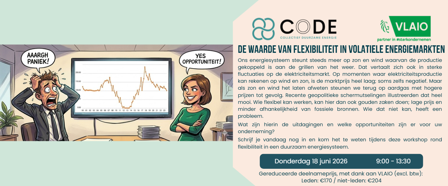 ![]() | Dit evenement wordt georganiseerd vanuit het Collectief Duurzame Energie (CoDE), onderdeel van het VLAIO-netwerk, en ter ondersteuning van bedrijven bij hun duurzame transitie. Samen met onze partners, Biogas-E, COGEN Vlaanderen, Flux50 en ODE Vlaanderen, bundelen we de krachten van vergroening, digitalisering en circulariteit. Onze focus ligt op samenwerking en het omarmen van innovatieve oplossingen om uw bedrijf te helpen groeien en verduurzamen. Meer informatie over CoDE en onze events op www.duurzame-energie.org. |